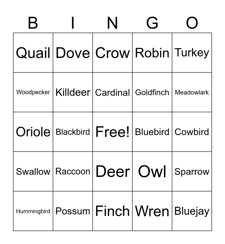This bingo card has a free space and 24 words: Raccoon, Possum, Cardinal, Hummingbird, Turkey, Quail, Woodpecker, Dove, Bluebird, Deer, Goldfinch, Oriole, Owl, Sparrow, Killdeer, Wren, Cowbird, Crow, Meadowlark, Blackbird, Bluejay, Swallow, Robin and Finch.
