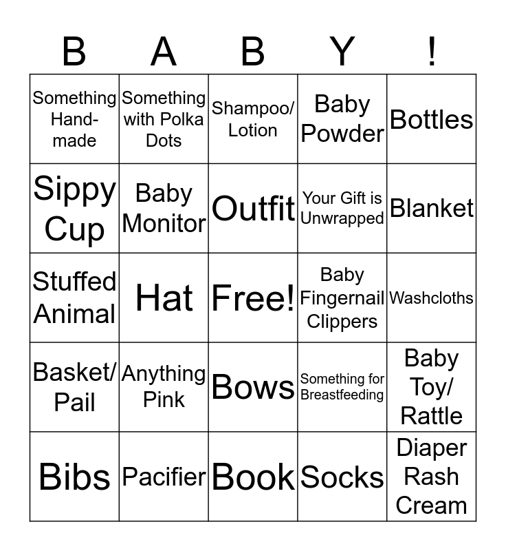 This bingo card has a free space and 24 words: Anything Pink, Pacifier, Outfit, Bibs, Bottles, Something Hand-made, Sippy Cup, Something with Polka Dots, Baby Fingernail Clippers, Bows, Your Gift is Unwrapped, Stuffed Animal, Something for Breastfeeding, Baby Toy/ Rattle, Baby Monitor, Socks, Washcloths, Shampoo/ Lotion, Blanket, Hat, Diaper Rash Cream, Basket/ Pail, Baby Powder and Book.
