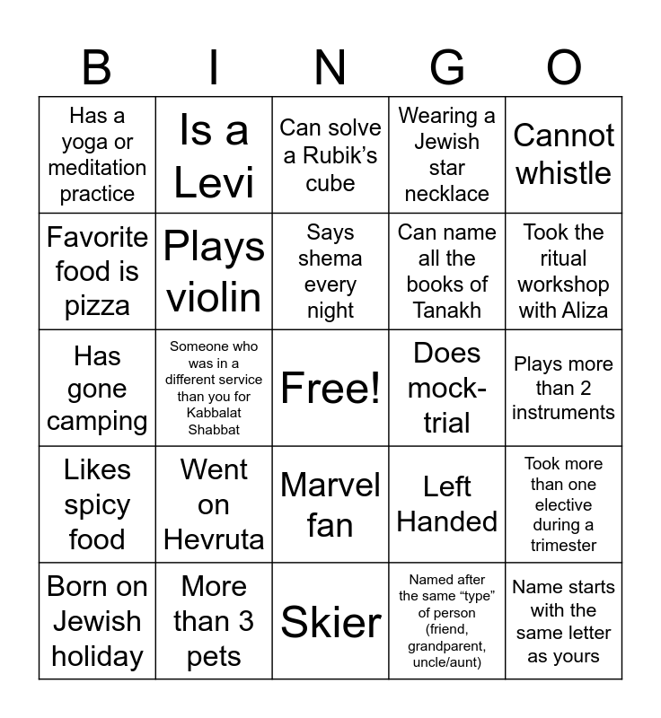 This bingo card has a free space and 30 words: More than 3 pets, Same elective as you for multiple semesters, Someone who was in a different service than you for Kabbalat Shabbat, Lived in 4 or more states, Has a yoga or meditation practice, Can solve a Rubik’s cube, Plays violin, Marvel fan, Does mock-trial, Skier, Plays more than 2 instruments, Name starts with the same letter as yours, Named after the same “type” of person (friend, grandparent, uncle/aunt), Birthday is in the same month, Took the ritual workshop with Aliza, Vegan, Left Handed, Likes spicy food, Went on Hevruta, Cannot whistle, Has gone camping, Never drank coffee, Is a Levi, Can name all the books of Tanakh, Favorite food is pizza, Wearing a Jewish star necklace, Took more than one elective during a trimester, Born on Jewish holiday, Says shema every night and Same shoe size.