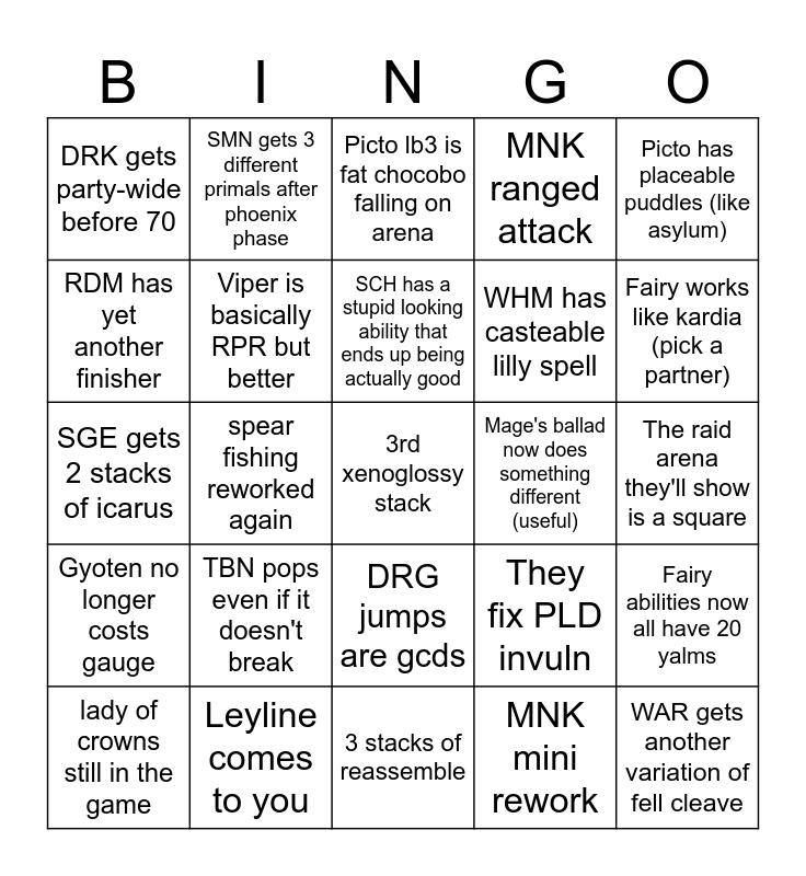 This bingo card has a free space and 24 words: TBN pops even if it doesn't break, Leyline comes to you, SCH has a stupid looking ability that ends up being actually good, lady of crowns still in the game, Picto has placeable puddles (like asylum), DRK gets party-wide before 70, RDM has yet another finisher, SMN gets 3 different primals after phoenix phase, Mage's ballad now does something different (useful), DRG jumps are gcds, WHM has casteable lilly spell, SGE gets 2 stacks of icarus, They fix PLD invuln, Fairy abilities now all have 20 yalms, Viper is basically RPR but better, MNK mini rework, The raid arena they'll show is a square, Picto lb3 is fat chocobo falling on arena, Fairy works like kardia (pick a partner), spear fishing reworked again, WAR gets another variation of fell cleave, Gyoten no longer costs gauge, MNK ranged attack and 3 stacks of reassemble.