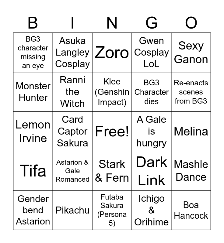 This bingo card has a free space and 24 words: Gender bend Astarion, Astarion & Gale Romanced, Klee (Genshin Impact), Ichigo & Orihime, Sexy Ganon, BG3 character missing an eye, Asuka Langley Cosplay, Zoro, A Gale is hungry, Melina, Lemon Irvine, Ranni the Witch, Dark Link, Mashle Dance, Monster Hunter, Pikachu, Futaba Sakura (Persona 5), Gwen Cosplay LoL, Re-enacts scenes from BG3, Tifa, Card Captor Sakura, Stark & Fern, BG3 Character dies and Boa Hancock.