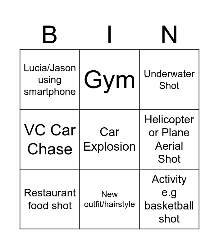 This bingo card has a free space and 8 words: Helicopter or Plane Aerial Shot, Underwater Shot, Gym, Restaurant food shot, Lucia/Jason using smartphone, Activity e.g basketball shot, VC Car Chase and New outfit/hairstyle.