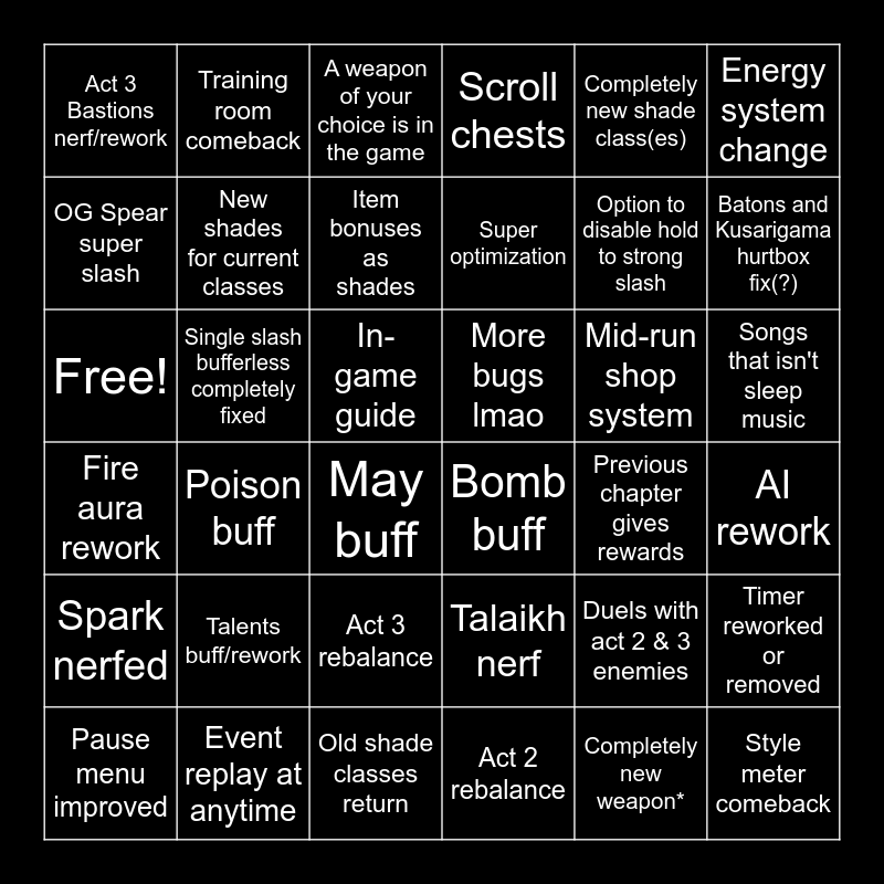 This bingo card has 36 words: Talaikh nerf, Act 3 rebalance, Act 2 rebalance, OG Spear super slash, Fire aura rework, More bugs lmao, New shades for current classes, Old shade classes return, Completely new shade class(es), Duels with act 2 & 3 enemies, Batons and Kusarigama hurtbox fix(?), Scroll chests, Timer reworked or removed, Single slash bufferless completely fixed, Super optimization, Act 3 Bastions nerf/rework, Spark nerfed, Mid-run shop system, Free!, A weapon of your choice is in the game, In-game guide, Poison buff, Bomb buff, May buff, Previous chapter gives rewards, Training room comeback, Option to disable hold to strong slash, Event replay at anytime, Item bonuses as shades, Energy system change, Style meter comeback, Pause menu improved, AI rework, Songs that isn't sleep music, Talents buff/rework and Completely new weapon*.