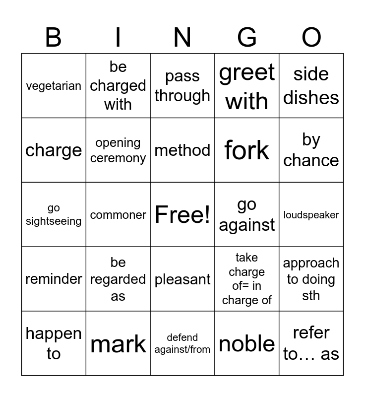 This bingo card has a free space and 46 words: leave behind, refer to… as, be blocked by, defend against/from, be regarded as, witness, be charged with, amount to, charge, battle against, opening ceremony, greet with, approach to doing sth, take charge of= in charge of, popularity, process, method, go against, believe in, side dishes, commoner, noble, vegetarian, fork, come into use, by chance, happen to, make up, pleasant, reminder, message, excuse, store, task, lesson, mark, loudspeaker, sign, gift, award, pull over the snow, pass through, go sightseeing, means of transportation, medical care=health care and make business deals.