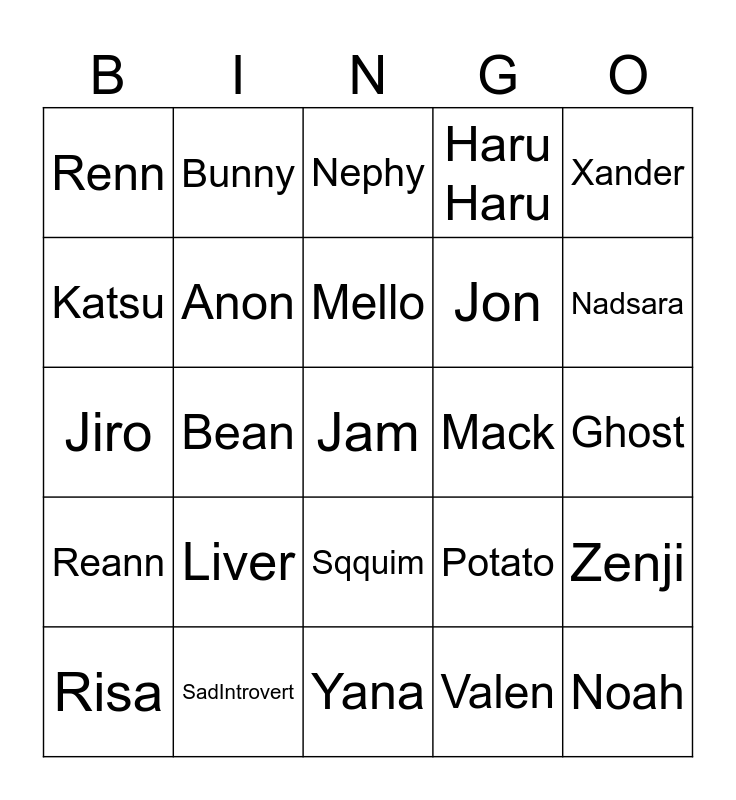 This bingo card has a free space and 24 words: Liver, SadIntrovert, Mello, Risa, Xander, Renn, Katsu, Bunny, Mack, Sqquim, Jon, Jiro, Potato, Zenji, Anon, Valen, Ghost, Nephy, Nadsara, Bean, Noah, Reann, Haru Haru and Yana.