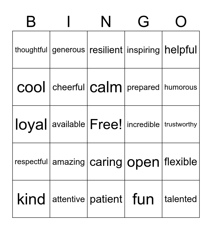 This bingo card has a free space and 25 words: amazing, patient, calm, kind, helpful, thoughtful, cool, generous, incredible, caring, prepared, loyal, open, flexible, cheerful, smart, trustworthy, resilient, humorous, available, talented, attentive, respectful, inspiring and fun.