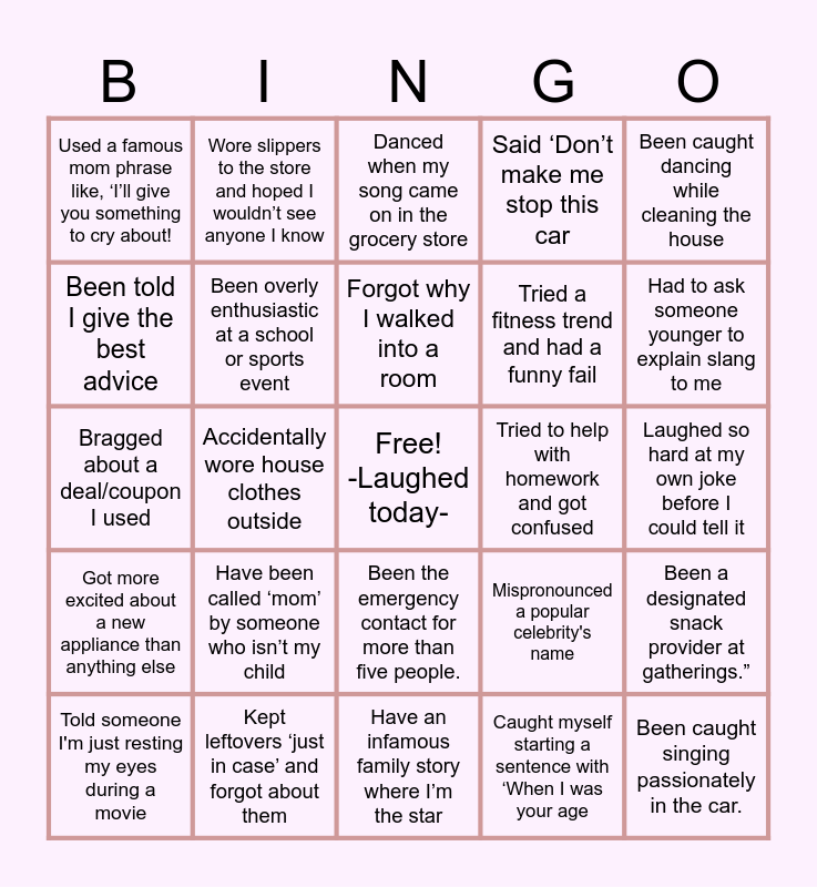 This bingo card has a free space and 24 words: Told someone I'm just resting my eyes during a movie, Have been called ‘mom’ by someone who isn’t my child, Forgot why I walked into a room, Caught myself starting a sentence with ‘When I was your age, Been caught dancing while cleaning the house, Used a famous mom phrase like, ‘I’ll give you something to cry about!, Wore slippers to the store and hoped I wouldn’t see anyone I know, Danced when my song came on in the grocery store, Tried to help with homework and got confused, Laughed so hard at my own joke before I could tell it, Bragged about a deal/coupon I used, Been overly enthusiastic at a school or sports event, Mispronounced a popular celebrity's name, Been a designated snack provider at gatherings.”, Been told I give the best advice, Kept leftovers ‘just in case’ and forgot about them, Have an infamous family story where I’m the star, Said ‘Don’t make me stop this car, Had to ask someone younger to explain slang to me, Got more excited about a new appliance than anything else, Accidentally wore house clothes outside, Been the emergency contact for more than five people., Tried a fitness trend and had a funny fail and Been caught singing passionately in the car..