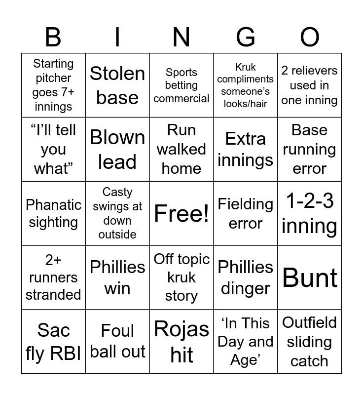 This bingo card has a free space and 24 words: Phillies win, Foul ball out, Run walked home, Sac fly RBI, 2 relievers used in one inning, Starting pitcher goes 7+ innings, “I’ll tell you what”, Stolen base, Fielding error, Off topic kruk story, Extra innings, Phanatic sighting, Phillies dinger, Bunt, Blown lead, ‘In This Day and Age’, 1-2-3 inning, Sports betting commercial, Base running error, Casty swings at down outside, Outfield sliding catch, 2+ runners stranded, Kruk compliments someone’s looks/hair and Rojas hit.