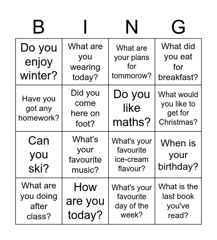 This bingo card has 16 words: How are you today?, When is your birthday?, What are your plans for tommorow?, Do you enjoy winter?, Can you ski?, What are you wearing today?, What's your favourite ice-cream flavour?, What's your favourite day of the week?, Have you got any homework?, Did you come here on foot?, What are you doing after class?, What did you eat for breakfast?, What's your favourite music?, What would you like to get for Christmas?, Do you like maths? and What is the last book you've read?.