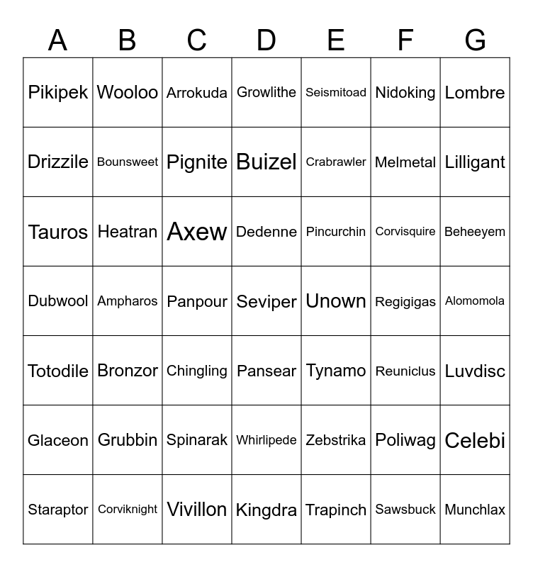 This bingo card has 899 words: Free!, Falinks, Farfetch'd, Fearow, Feebas, Fennekin, Feraligatr, Ferroseed, Ferrothorn, Finneon, Flaaffy, Flabébé, Flapple, Flareon, Fletchinder, Fletchling, Floatzel, Floette, Florges, Flygon, Fomantis, Foongus, Forretress, Fraxure, Frillish, Froakie, Frogadier, Froslass, Frosmoth, Furfrou, Furret, Eelektrik, Eelektross, Eevee, Eiscue, Ekans, Eldegoss, Electabuzz, Electivire, Electrike, Electrode, Elekid, Elgyem, Emboar, Emolga, Empoleon, Entei, Escavalier, Espeon, Espurr, Eternatus, Excadrill, Exeggcute, Exeggutor, Exploud, Darkrai, Darmanitan, Dartrix, Darumaka, Decidueye, Dedenne, Deerling, Deino, Delcatty, Delibird, Delphox, Deoxys, Dewgong, Dewott, Dewpider, Dhelmise, Dialga, Diancie, Diggersby, Diglett, Ditto, Dodrio, Doduo, Donphan, Dottler, Doublade, Dracovish, Dracozolt, Dragalge, Dragapult, Dragonair, Dragonite, Drakloak, Drampa, Drapion, Dratini, Drednaw, Dreepy, Drifblim, Drifloon, Drilbur, Drizzile, Drowzee, Druddigon, Dubwool, Ducklett, Dugtrio, Dunsparce, Duosion, Duraludon, Durant, Dusclops, Dusknoir, Duskull, Dustox, Dwebble, Cacnea, Cacturne, Calyrex, Camerupt, Carbink, Carkol, Carnivine, Carracosta, Carvanha, Cascoon, Castform, Caterpie, Celebi, Celesteela, Centiskorch, Chandelure, Chansey, Charizard, Charjabug, Charmander, Charmeleon, Chatot, Cherrim, Cherubi, Chesnaught, Chespin, Chewtle, Chikorita, Chimchar, Chimecho, Chinchou, Chingling, Cinccino, Cinderace, Clamperl, Clauncher, Clawitzer, Claydol, Clefable, Clefairy, Cleffa, Clobbopus, Cloyster, Coalossal, Cobalion, Cofagrigus, Combee, Combusken, Comfey, Conkeldurr, Copperajah, Corphish, Corsola, Corviknight, Corvisquire, Cosmoem, Cosmog, Cottonee, Crabominable, Crabrawler, Cradily, Cramorant, Cranidos, Crawdaunt, Cresselia, Croagunk, Crobat, Croconaw, Crustle, Cryogonal, Cubchoo, Cubone, Cufant, Cursola, Cutiefly, Cyndaquil, Bagon, Baltoy, Banette, Barbaracle, Barboach, Barraskewda, Basculin, Bastiodon, Bayleef, Beartic, Beautifly, Beedrill, Beheeyem, Beldum, Bellossom, Bellsprout, Bergmite, Bewear, Bibarel, Bidoof, Binacle, Bisharp, Blacephalon, Blastoise, Blaziken, Blipbug, Blissey, Blitzle, Boldore, Boltund, Bonsly, Bouffalant, Bounsweet, Braixen, Braviary, Breloom, Brionne, Bronzong, Bronzor, Bruxish, Budew, Buizel, Bulbasaur, Buneary, Bunnelby, Burmy, Butterfree, Buzzwole, Abomasnow, Abra, Absol, Accelgor, Aegislash, Aerodactyl, Aggron, Aipom, Alakazam, Alcremie, Alomomola, Altaria, Amaura, Ambipom, Amoonguss, Ampharos, Anorith, Appletun, Applin, Araquanid, Arbok, Arcanine, Arceus, Archen, Archeops, Arctovish, Arctozolt, Ariados, Armaldo, Aromatisse, Aron, Arrokuda, Articuno, Audino, Aurorus, Avalugg, Axew, Azelf, Azumarill, Azurill, Gabite, Gallade, Galvantula, Garbodor, Garchomp, Gardevoir, Gastly, Gastrodon, Genesect, Gengar, Geodude, Gible, Gigalith, Girafarig, Giratina, Glaceon, Glalie, Glameow, Glastrier, Gligar, Gliscor, Gloom, Gogoat, Golbat, Goldeen, Golduck, Golem, Golett, Golisopod, Golurk, Goodra, Goomy, Gorebyss, Gossifleur, Gothita, Gothitelle, Gothorita, Gourgeist, Granbull, Grapploct, Graveler, Greedent, Greninja, Grimer, Grimmsnarl, Grookey, Grotle, Groudon, Grovyle, Growlithe, Grubbin, Grumpig, Gulpin, Gumshoos, Gurdurr, Guzzlord, Gyarados, Hakamo-o, Happiny, Hariyama, Hatenna, Hatterene, Hattrem, Haunter, Hawlucha, Haxorus, Heatmor, Heatran, Heliolisk, Helioptile, Heracross, Herdier, Hippopotas, Hippowdon, Hitmonchan, Hitmonlee, Hitmontop, Honchkrow, Honedge, Ho-Oh, Hoopa, Hoothoot, Hoppip, Horsea, Houndoom, Houndour, Huntail, Hydreigon, Hypno, Igglybuff, Illumise, Impidimp, Incineroar, Indeedee, Infernape, Inkay, Inteleon, Ivysaur, Jangmo-o, Jellicent, Jigglypuff, Jirachi, Jolteon, Joltik, Jumpluff, Jynx, Kabuto, Kabutops, Kadabra, Kakuna, Kangaskhan, Karrablast, Kartana, Kecleon, Keldeo, Kingdra, Kingler, Kirlia, Klang, Klefki, Klink, Klinklang, Koffing, Komala, Kommo-o, Krabby, Kricketot, Kricketune, Krokorok, Krookodile, Kubfu, Kyogre, Kyurem, Lairon, Lampent, Landorus, Lanturn, Lapras, Larvesta, Larvitar, Latias, Latios, Leafeon, Leavanny, Ledian, Ledyba, Lickilicky, Lickitung, Liepard, Lileep, Lilligant, Lillipup, Linoone, Litleo, Litten, Litwick, Lombre, Lopunny, Lotad, Loudred, Lucario, Ludicolo, Lugia, Lumineon, Lunala, Lunatone, Lurantis, Luvdisc, Luxio, Luxray, Lycanroc, Machamp, Machoke, Machop, Magby, Magcargo, Magearna, Magikarp, Magmar, Magmortar, Magnemite, Magneton, Magnezone, Makuhita, Malamar, Mamoswine, Manaphy, Mandibuzz, Manectric, Mankey, Mantine, Mantyke, Maractus, Mareanie, Mareep, Marill, Marowak, Marshadow, Marshtomp, Masquerain, Mawile, Medicham, Meditite, Meganium, Melmetal, Meloetta, Meltan, Meowstic, Meowth, Mesprit, Metagross, Metang, Metapod, Mew, Mewtwo, Mienfoo, Mienshao, Mightyena, Milcery, Milotic, Miltank, Mime Jr., Mimikyu, Minccino, Minior, Minun, Misdreavus, Mismagius, Moltres, Monferno, Morelull, Morgrem, Morpeko, Mothim, Mr. Mime, Mr. Rime, Mudbray, Mudkip, Mudsdale, Muk, Munchlax, Munna, Murkrow, Musharna, Naganadel, Natu, Necrozma, Nickit, Nidoking, Nidoqueen, Nidoran♀, Nidoran♂, Nidorina, Nidorino, Nihilego, Nincada, Ninetales, Ninjask, Noctowl, Noibat, Noivern, Nosepass, Numel, Nuzleaf, Obstagoon, Octillery, Oddish, Omanyte, Omastar, Onix, Oranguru, Orbeetle, Oricorio, Oshawott, Pachirisu, Palkia, Palossand, Palpitoad, Pancham, Pangoro, Panpour, Pansage, Pansear, Paras, Parasect, Passimian, Patrat, Pawniard, Pelipper, Perrserker, Persian, Petilil, Phanpy, Phantump, Pheromosa, Phione, Pichu, Pidgeot, Pidgeotto, Pidgey, Pidove, Pignite, Pikachu, Pikipek, Piloswine, Pincurchin, Pineco, Pinsir, Piplup, Plusle, Poipole, Politoed, Poliwag, Poliwhirl, Poliwrath, Polteageist, Ponyta, Poochyena, Popplio, Porygon, Porygon2, Porygon-Z, Primarina, Primeape, Prinplup, Probopass, Psyduck, Pumpkaboo, Pupitar, Purrloin, Purugly, Pyroar, Pyukumuku, Quagsire, Quilava, Quilladin, Qwilfish, Raboot, Raichu, Raikou, Ralts, Rampardos, Rapidash, Raticate, Rattata, Rayquaza, Regice, Regidrago, Regieleki, Regigigas, Regirock, Regi
