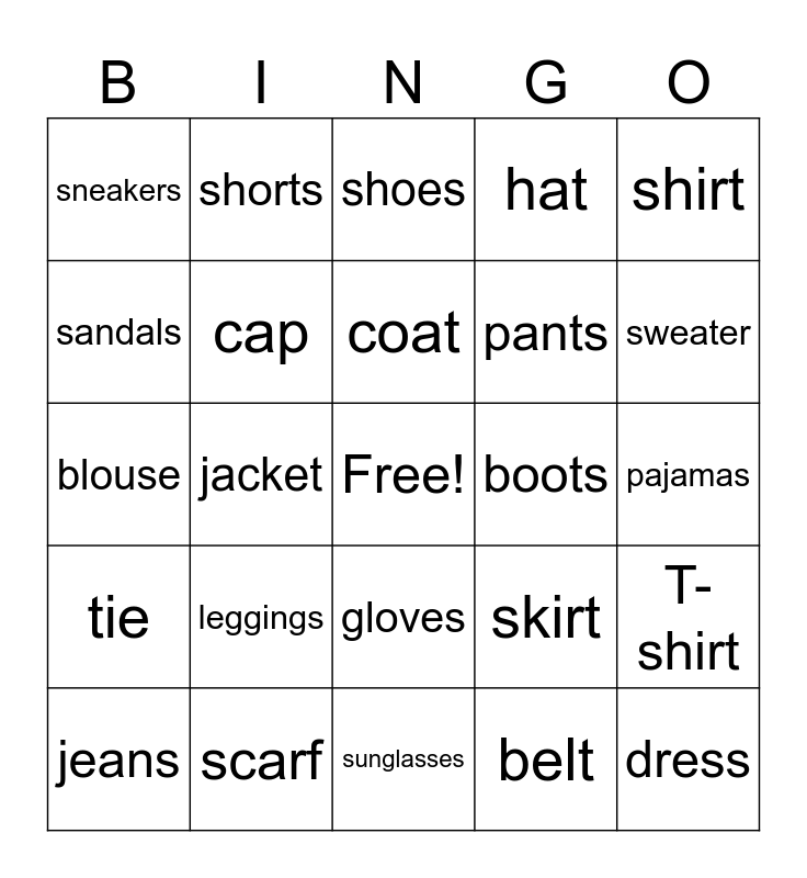 This bingo card has a free space and 24 words: leggings, scarf, coat, jeans, shirt, sneakers, sandals, shorts, boots, gloves, pants, blouse, skirt, T-shirt, cap, belt, pajamas, shoes, sweater, jacket, dress, tie, hat and sunglasses.