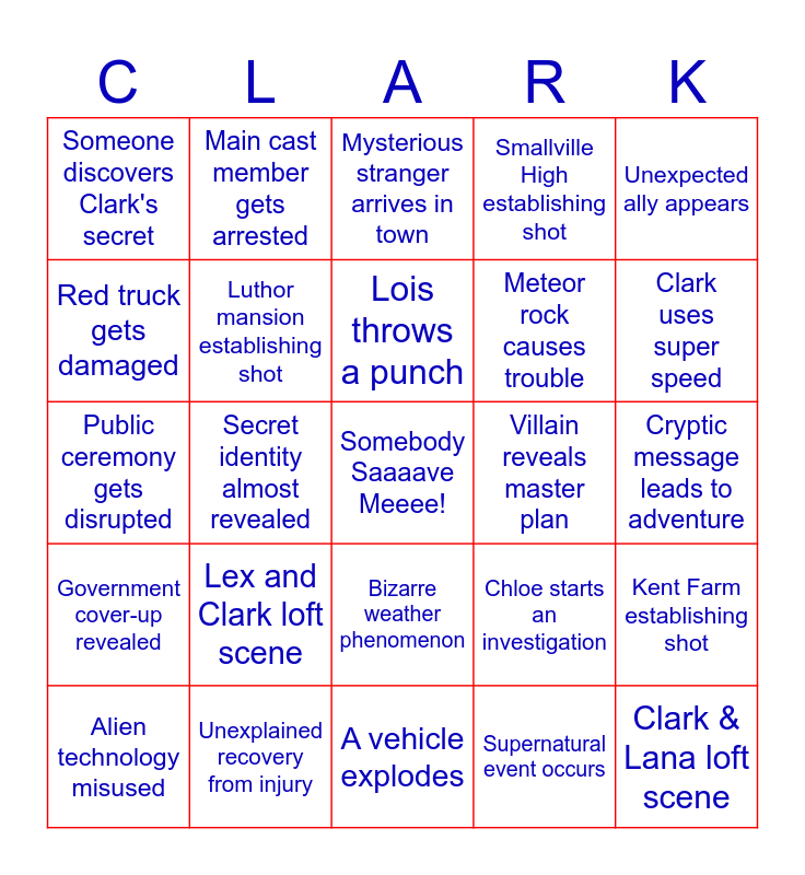 This bingo card has a free space and 50 words: Smallville Medical, Clark & Lana loft scene, A vehicle gets wrecked, A vehicle explodes, Lex and Clark loft scene, Hostage situation, Main cast member gets arrested, Alter ego or personality, Red truck gets damaged, Daily Planet, Luthor mansion establishing shot, Smallville High establishing shot, Kent Farm establishing shot, Chloe starts an investigation, Lex unveils a secret project, Lana in peril, Lois throws a punch, Villain reveals master plan, Kryptonite-induced weakness, Unexpected ally appears, Secret identity almost revealed, Supernatural event occurs, Someone discovers Clark's secret, Meteor rock causes trouble, Emotional goodbye scene, Someone returns from the dead, Clark uses super speed, Kryptonian artifact discovered, Mysterious stranger arrives in town, Bizarre weather phenomenon, Villain has a change of heart, Last-minute rescue, Character has a moral dilemma, Lex manipulates a situation, Unexplained recovery from injury, Major plot twist, Character gets mind-controlled, Justice League reference, Wall of Weird gets updated, Cryptic message leads to adventure, Family secret is uncovered, Time travel or flashback, Underground lab scene, Someone mentions "destiny", Alien technology misused, Public ceremony gets disrupted, Celebrity cameo, Heroic sacrifice, Government cover-up revealed and Supernatural creature sighting.