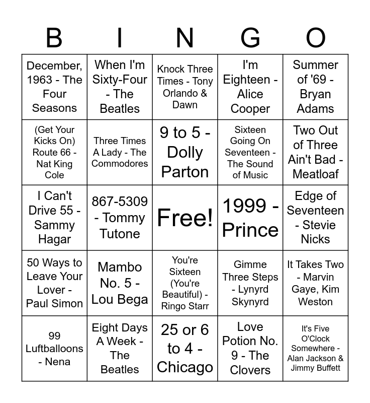 This bingo card has a free space and 24 words: Mambo No. 5 - Lou Bega, Eight Days A Week - The Beatles, 9 to 5 - Dolly Parton, 99 Luftballoons - Nena, Summer of '69 - Bryan Adams, December, 1963 - The Four Seasons, (Get Your Kicks On) Route 66 - Nat King Cole, When I'm Sixty-Four - The Beatles, 1999 - Prince, You're Sixteen (You're Beautiful) - Ringo Starr, Sixteen Going On Seventeen - The Sound of Music, I Can't Drive 55 - Sammy Hagar, Gimme Three Steps - Lynyrd Skynyrd, It Takes Two - Marvin Gaye, Kim Weston, Three Times A Lady - The Commodores, Love Potion No. 9 - The Clovers, Edge of Seventeen - Stevie Nicks, Knock Three Times - Tony Orlando & Dawn, Two Out of Three Ain't Bad - Meatloaf, 867-5309 - Tommy Tutone, It's Five O'Clock Somewhere - Alan Jackson & Jimmy Buffett, 50 Ways to Leave Your Lover - Paul Simon, I'm Eighteen - Alice Cooper and 25 or 6 to 4 - Chicago.