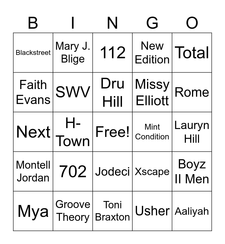 This bingo card has a free space and 24 words: 702, Groove Theory, Dru Hill, Mya, Total, Blackstreet, Faith Evans, Mary J. Blige, Mint Condition, Jodeci, Missy Elliott, Next, Xscape, Boyz II Men, SWV, Usher, Lauryn Hill, 112, Rome, H-Town, Aaliyah, Montell Jordan, New Edition and Toni Braxton.