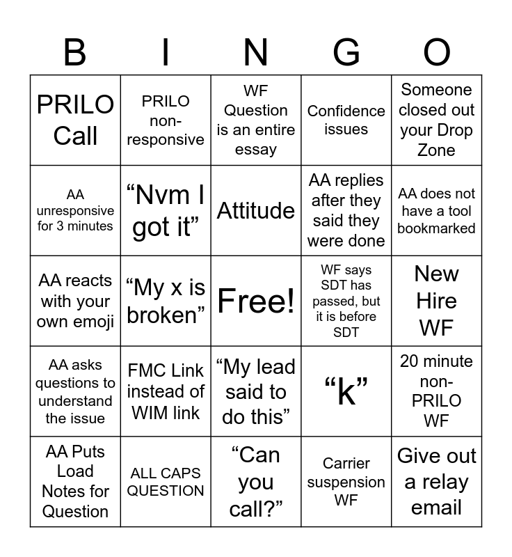 This bingo card has a free space and 25 words: FMC Link instead of WIM link, “Can you call?”, Attitude, AA Puts Load Notes for Question, Someone closed out your Drop Zone, PRILO Call, AA unresponsive for 3 minutes, PRILO non-responsive, WF says SDT has passed, but it is before SDT, “My lead said to do this”, AA replies after they said they were done, AA reacts with your own emoji, “k”, 20 minute non-PRILO WF, “Nvm I got it”, Extremely thankful AA, New Hire WF, WF Question is an entire essay, AA does not have a tool bookmarked, “My x is broken”, Give out a relay email, ALL CAPS QUESTION, AA asks questions to understand the issue, Confidence issues and Carrier suspension WF.