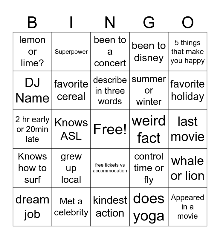 This bingo card has a free space and 25 words: grew up local, kindest action, describe in three words, dream job, 5 things that make you happy, lemon or lime?, DJ Name, Superpower, weird fact, free tickets vs accommodation, summer or winter, 2 hr early or 20min late, control time or fly, whale or lion, favorite cereal, last tv show, last movie, been to a concert, favorite holiday, Knows ASL, Appeared in a movie, Met a celebrity, Knows how to surf, been to disney and does yoga.