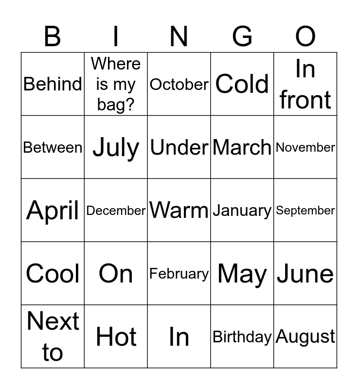 This bingo card has 25 words: On, In, Under, Next to, In front, Behind, Between, Where is my bag?, January, February, March, April, May, June, July, August, September, October, November, December, Warm, Hot, Cool, Cold and Birthday.