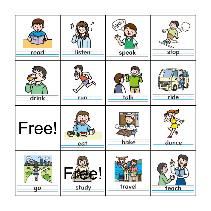 This bingo card has 26 images and 2 words: Free! and Free!.
