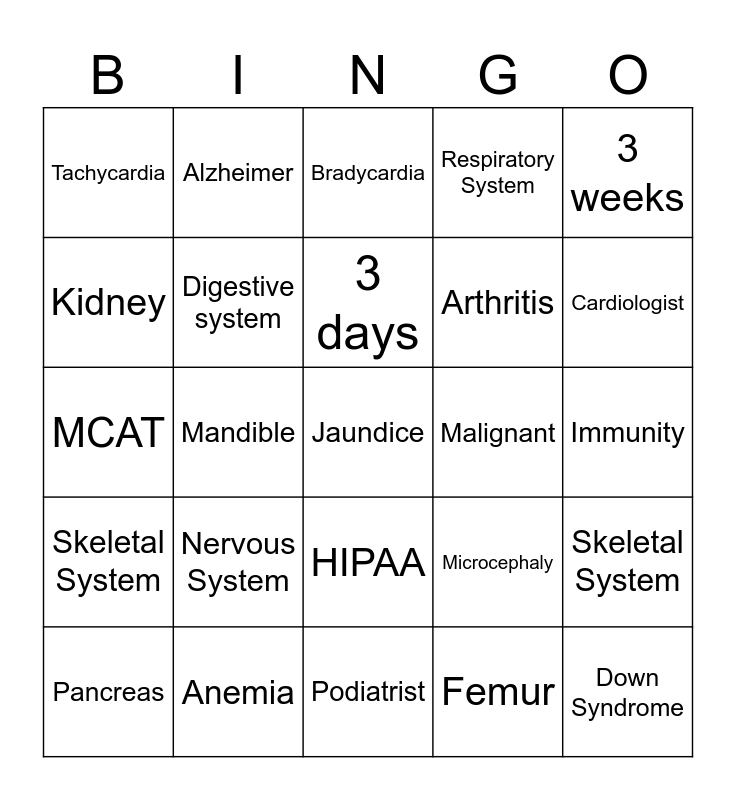 This bingo card has 29 words: Pancreas, Dermatologist, Mandible, Down Syndrome, Tachycardia, Bradycardia, Digestive system, Nervous System, Malignant, Anemia, Immunity, Jaundice, Podiatrist, Femur, Cardiologist, Bipolar Disorder, HIPAA, Skeletal System, 3 weeks, MCAT, Microcephaly, Bronchitis, Arthritis, Kidney, Respiratory System, Alzheimer, Skeletal System, 3 days and Skin.