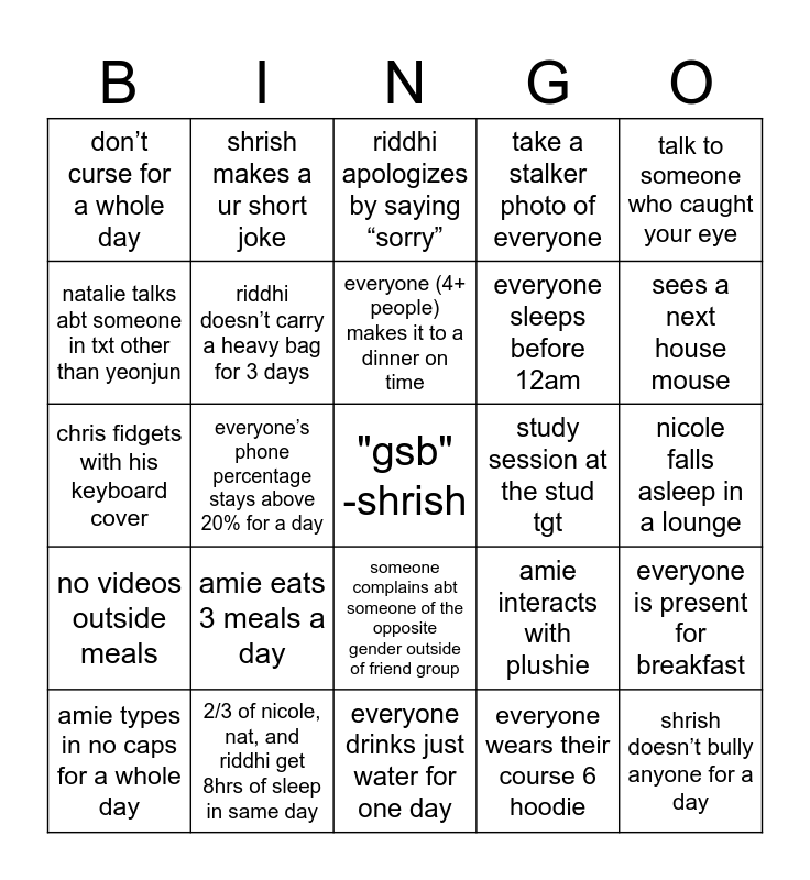 This bingo card has a free space and 24 words: amie eats 3 meals a day, 2/3 of nicole, nat, and riddhi get 8hrs of sleep in same day, everyone (4+ people) makes it to a dinner on time, amie types in no caps for a whole day, talk to someone who caught your eye, don’t curse for a whole day, natalie talks abt someone in txt other than yeonjun, shrish makes a ur short joke, study session at the stud tgt, someone complains abt someone of the opposite gender outside of friend group, everyone sleeps before 12am, chris fidgets with his keyboard cover, amie interacts with plushie, everyone is present for breakfast, riddhi doesn’t carry a heavy bag for 3 days, everyone wears their course 6 hoodie, nicole falls asleep in a lounge, riddhi apologizes by saying “sorry”, sees a next house mouse, everyone’s phone percentage stays above 20% for a day, shrish doesn’t bully anyone for a day, no videos outside meals, take a stalker photo of everyone and everyone drinks just water for one day.