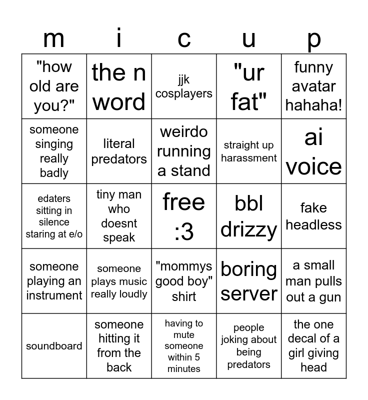 This bingo card has a free space and 24 words: someone plays music really loudly, someone hitting it from the back, weirdo running a stand, soundboard, funny avatar hahaha!, "how old are you?", someone singing really badly, the n word, bbl drizzy, "mommys good boy" shirt, straight up harassment, edaters sitting in silence staring at e/o, boring server, a small man pulls out a gun, literal predators, people joking about being predators, fake headless, jjk cosplayers, ai voice, tiny man who doesnt speak, the one decal of a girl giving head, someone playing an instrument, "ur fat" and having to mute someone within 5 minutes.