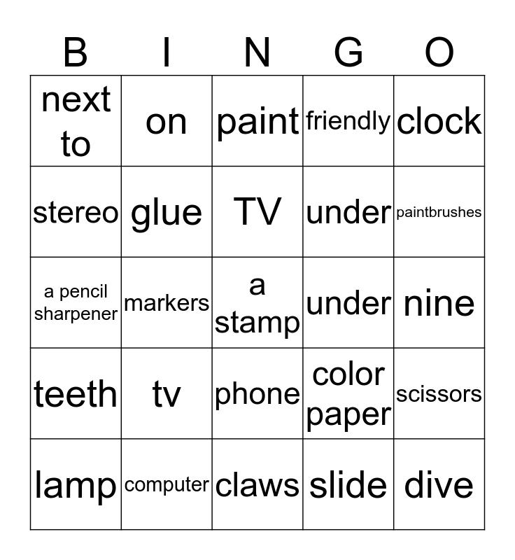 This bingo card has a free space and 24 words: tv, computer, TV, lamp, clock, next to, stereo, on, under, phone, under, a pencil sharpener, color paper, scissors, glue, slide, nine, paint, paintbrushes, markers, dive, teeth, friendly and claws.
