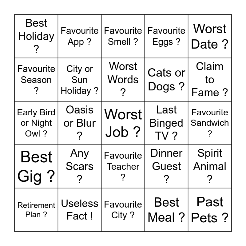 This bingo card has 35 words: Favourite Movie ?, Last Book you Read ?, Forest or Sea ?, Cats or Dogs ?, Past Pets ?, Best Holiday ?, City or Sun Holiday ?, Favourite Drink ?, Last Binged TV ?, Worst Habit ?, Early Bird or Night Owl ?, Favourite App ?, Favourite Teacher ?, Odd Talent ?, Worst Date ?, Best Gig ?, Useless Fact !, Favourite Smell ?, Best Meal ?, Favourite Sandwich ?, Retirement Plan ?, Oasis or Blur ?, Worst Job ?, Favourite Quote ?, Claim to Fame ?, Favourite Season ?, Dream Car ?, Favourite City ?, Dinner Guest ?, Spirit Animal ?, Favourite Meme ?, Any Scars ?, Worst Words ?, Favourite Eggs ? and Favourite Colour ?.