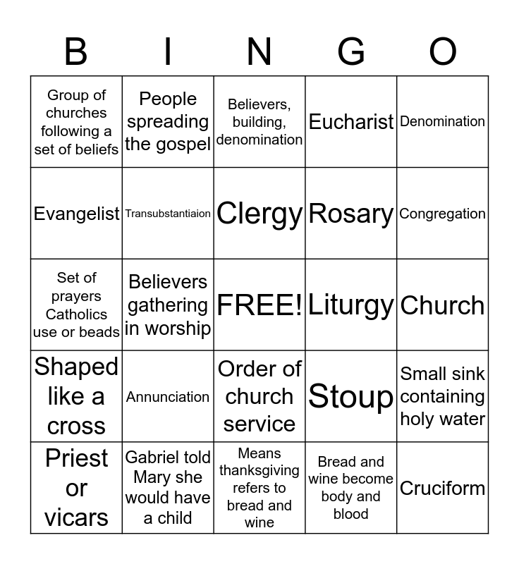 This bingo card has a free space and 24 words: Annunciation, Gabriel told Mary she would have a child, Clergy, Priest or vicars, Denomination, Group of churches following a set of beliefs, Evangelist, People spreading the gospel, Liturgy, Order of church service, Rosary, Set of prayers Catholics use or beads, Stoup, Small sink containing holy water, Transubstantiaion, Bread and wine become body and blood, Church, Believers, building, denomination, Congregation, Believers gathering in worship, Cruciform, Shaped like a cross, Eucharist and Means thanksgiving refers to bread and wine.