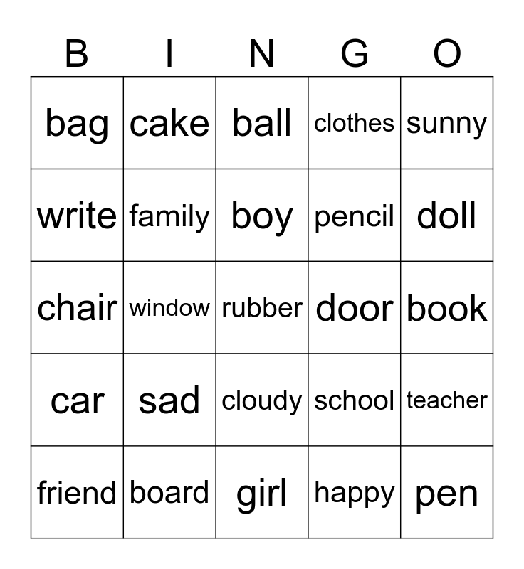 This bingo card has 25 words: sad, girl, boy, friend, sunny, bag, write, cake, door, cloudy, pencil, chair, school, teacher, family, pen, book, ball, doll, window, rubber, board, car, clothes and happy.