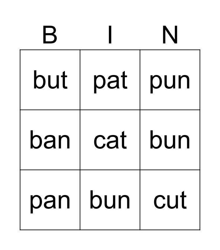 This bingo card has 9 words: pan, pun, pat, ban, but, bun, cat, cut and bun.