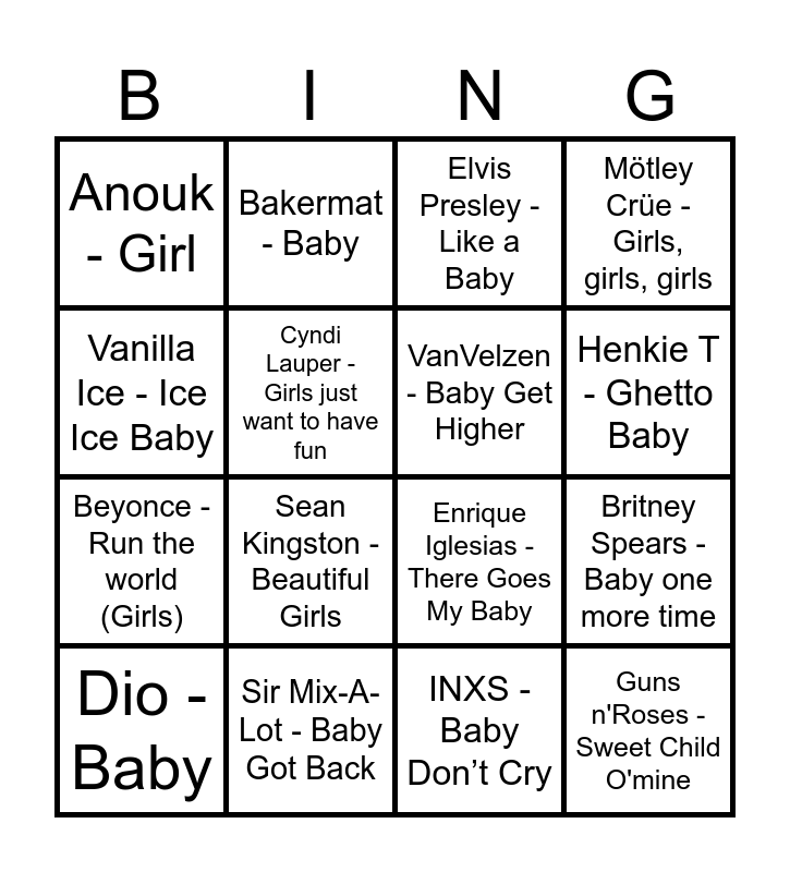 This bingo card has 32 words: Baby shark, Justin Bieber - Baby, Britney Spears - Baby one more time, The Supremes - Baby Love, Guns n'Roses - Sweet Child O'mine, VanVelzen - Baby Get Higher, Vanilla Ice - Ice Ice Baby, UB40 - Cherry oh Baby, Bakermat - Baby, Surf Mesa - ily, Henkie T - Ghetto Baby, Elvis Presley - Like a Baby, Yung Bleu - Ice on my Baby, Corona - Baby Baby, Sir Mix-A-Lot - Baby Got Back, Yung Felix - Baby Momma, The Beatles - Baby’s in Black, Enrique Iglesias - There Goes My Baby, Bruno Mars - Runaway Baby, No Doubt - Hey Baby, Cooldown - Don’t you Want Me Baby, Madison Avenue - Don’t Call Me Baby, INXS - Baby Don’t Cry, Big Mountain - Baby I love your way, Dio - Baby, Mötley Crüe - Girls, girls, girls, Beyonce - Run the world (Girls), Cyndi Lauper - Girls just want to have fun, Anouk - Girl, Alicia Keys - Girl on fire, Fifth Harmony - That’s my girl and Sean Kingston - Beautiful Girls.