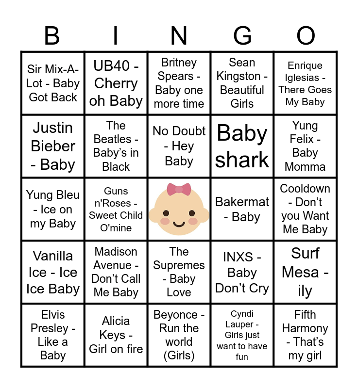 This bingo card has a free space and 32 words: Cyndi Lauper - Girls just want to have fun, Anouk - Girl, Guns n'Roses - Sweet Child O'mine, VanVelzen - Baby Get Higher, Vanilla Ice - Ice Ice Baby, The Beatles - Baby’s in Black, Enrique Iglesias - There Goes My Baby, Surf Mesa - ily, UB40 - Cherry oh Baby, Bruno Mars - Runaway Baby, No Doubt - Hey Baby, Britney Spears - Baby one more time, Mötley Crüe - Girls, girls, girls, Corona - Baby Baby, Bakermat - Baby, Henkie T - Ghetto Baby, Elvis Presley - Like a Baby, Yung Bleu - Ice on my Baby, The Supremes - Baby Love, Madison Avenue - Don’t Call Me Baby, INXS - Baby Don’t Cry, Big Mountain - Baby I love your way, Cooldown - Don’t you Want Me Baby, Alicia Keys - Girl on fire, Fifth Harmony - That’s my girl, Sean Kingston - Beautiful Girls, Baby shark, Justin Bieber - Baby, Sir Mix-A-Lot - Baby Got Back, Beyonce - Run the world (Girls), Dio - Baby and Yung Felix - Baby Momma.