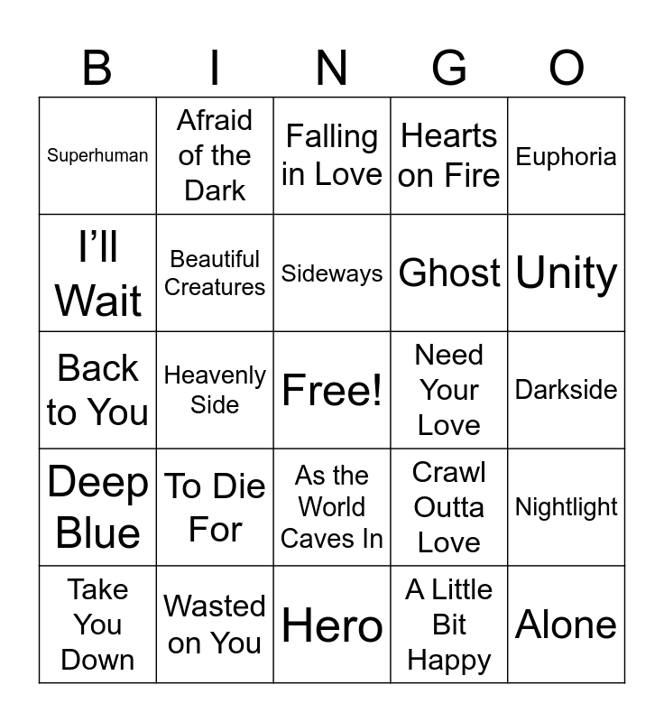 This bingo card has a free space and 37 words: In Your Arms, Free Fall, All You Need to Know, Beautiful Creatures, Nightlight, To Die For, Sideways, Fragile, Euphoria, After You, Heavenly Side, Hearts on Fire, Alone, Darkside, I’ll Wait, Deep Blue, Silence, Falling in Love, As the World Caves In, Need Your Love, Superhuman, Unity, Take You Down, Hero, Shatter Me, A Little Bit Happy, Afraid of the Dark, How Long, Run Away to Mars, All Around Me, Zombie, Wasted on You, Back to You, Say It, Crawl Outta Love, Ghost and Light.
