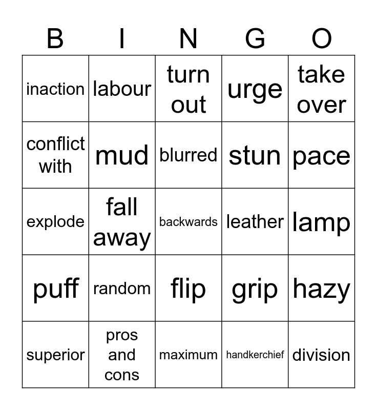 This bingo card has a free space and 24 words: random, pros and cons, blurred, superior, take over, inaction, conflict with, labour, leather, flip, stun, explode, grip, hazy, mud, handkerchief, lamp, turn out, pace, fall away, division, puff, urge and maximum.