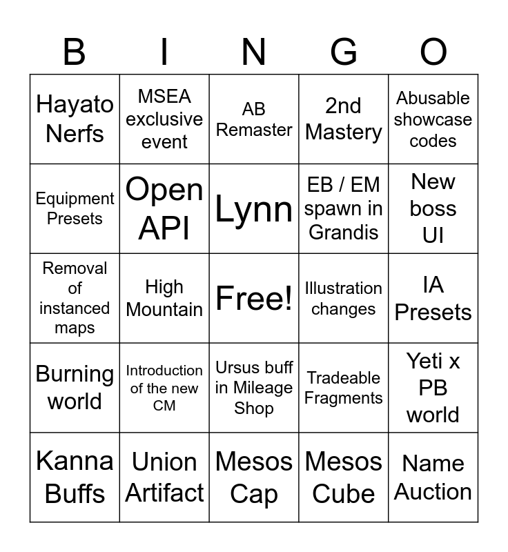 This bingo card has a free space and 24 words: Kanna Buffs, Introduction of the new CM, Lynn, Mesos Cube, Abusable showcase codes, Hayato Nerfs, MSEA exclusive event, AB Remaster, Illustration changes, IA Presets, Removal of instanced maps, Open API, Tradeable Fragments, Yeti x PB world, Equipment Presets, Union Artifact, Mesos Cap, 2nd Mastery, New boss UI, Burning world, High Mountain, Ursus buff in Mileage Shop, EB / EM spawn in Grandis and Name Auction.