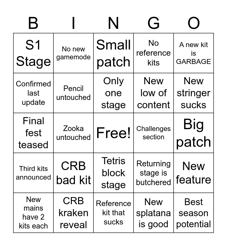 This bingo card has a free space and 24 words: CRB bad kit, CRB kraken reveal, Only one stage, New mains have 2 kits each, A new kit is GARBAGE, S1 Stage, Confirmed last update, No new gamemode, Challenges section, Tetris block stage, New low of content, Final fest teased, Returning stage is butchered, New feature, Pencil untouched, New splatana is good, Big patch, Small patch, New stringer sucks, Zooka untouched, Best season potential, Third kits announced, No reference kits and Reference kit that sucks.