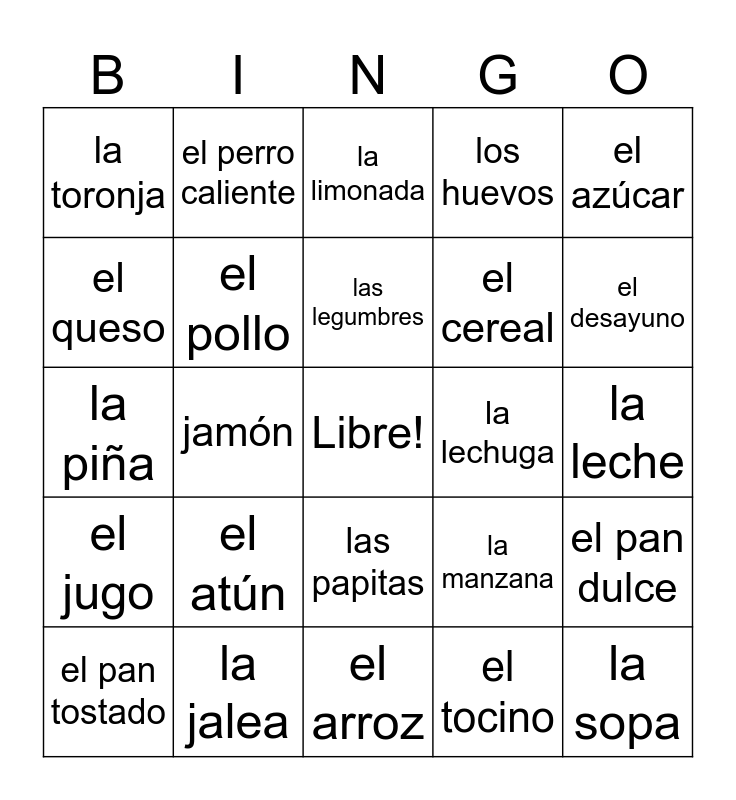This bingo card has a free space and 24 words: el atún, la jalea, las legumbres, el pan tostado, el azúcar, la toronja, el queso, el perro caliente, la lechuga, las papitas, el cereal, la piña, la manzana, el pan dulce, el pollo, el tocino, la leche, la limonada, el desayuno, jamón, la sopa, el jugo, los huevos and el arroz.