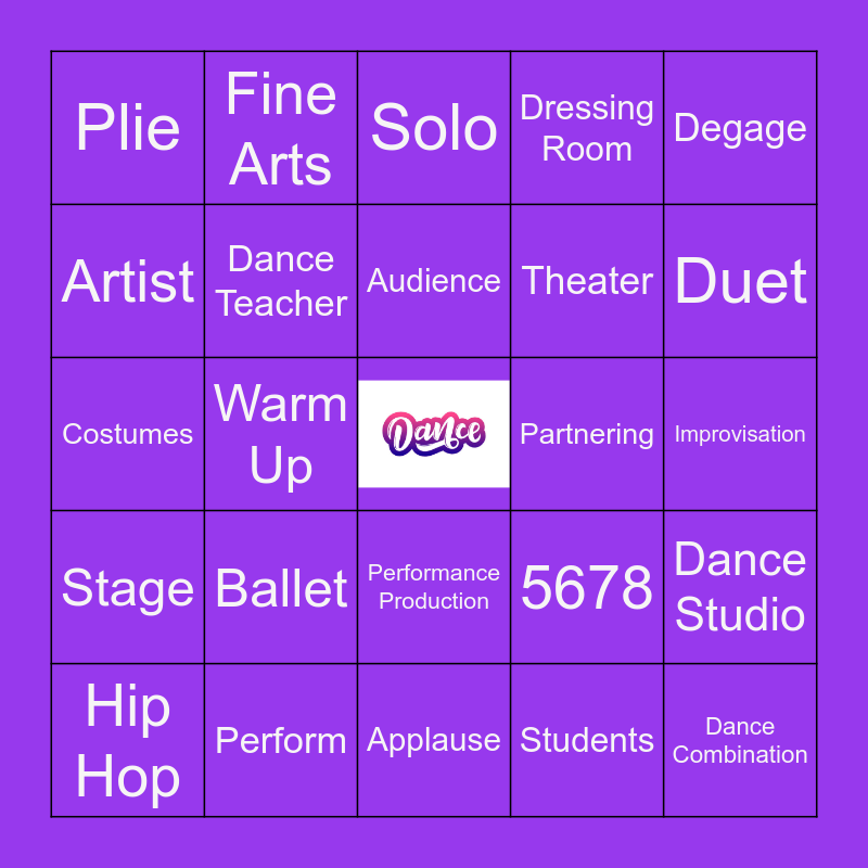 This bingo card has a free space and 24 words: Ballet, Perform, Audience, Hip Hop, Degage, Plie, Artist, Fine Arts, Partnering, Performance Production, Theater, Costumes, 5678, Dance Studio, Dance Teacher, Students, Improvisation, Solo, Duet, Warm Up, Dance Combination, Stage, Dressing Room and Applause.