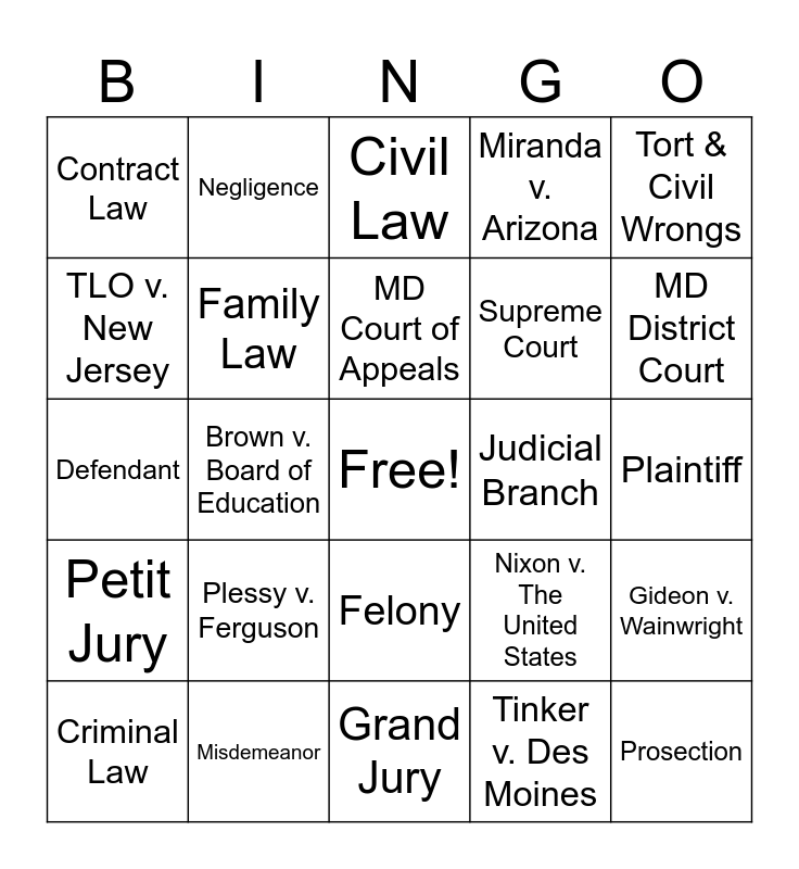 This bingo card has a free space and 24 words: Plessy v. Ferguson, Misdemeanor, MD Court of Appeals, Criminal Law, Tort & Civil Wrongs, Contract Law, TLO v. New Jersey, Negligence, Judicial Branch, Felony, Supreme Court, Defendant, Nixon v. The United States, Gideon v. Wainwright, Family Law, Tinker v. Des Moines, Plaintiff, Civil Law, MD District Court, Brown v. Board of Education, Prosection, Petit Jury, Miranda v. Arizona and Grand Jury.