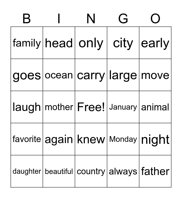 This bingo card has a free space and 24 words: again, beautiful, carry, daughter, early, family, goes, head, January, knew, large, laugh, Monday, night, ocean, always, animal, only, move, mother, father, favorite, city and country.