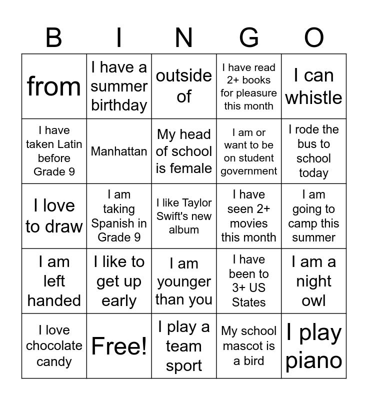 This bingo card has 30 words: Free!, I have a pet that's not a dog or cat, I am taking Spanish in Grade 9, I commute, from, outside of, Manhattan, I am younger than you, I have seen 2+ movies this month, I play a team sport, I am going to camp this summer, I like Taylor Swift's new album, My school mascot is a bird, I play piano, I rode the bus to school today, I am taking French in Grade 9, I have been to 3+ US States, I am left handed, I like to get up early, I can whistle, I love to draw, I live below 42nd Street, I have a summer birthday, I am or want to be on student government, I have taken Latin before Grade 9, I have read 2+ books for pleasure this month, I am a night owl, I love chocolate candy, My head of school is female and My school color is red.