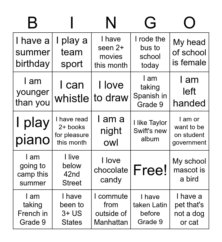 This bingo card has 27 words: Free!, I have a pet that's not a dog or cat, I am taking Spanish in Grade 9, I commute from outside of Manhattan, I am younger than you, I have seen 2+ movies this month, I play a team sport, I am going to camp this summer, I like Taylor Swift's new album, My school mascot is a bird, I play piano, I rode the bus to school today, I am taking French in Grade 9, I have been to 3+ US States, I am left handed, I like to get up early, I can whistle, I love to draw, I live below 42nd Street, I have a summer birthday, I am or want to be on student government, I have taken Latin before Grade 9, I have read 2+ books for pleasure this month, I am a night owl, I love chocolate candy, My head of school is female and My school color is red.