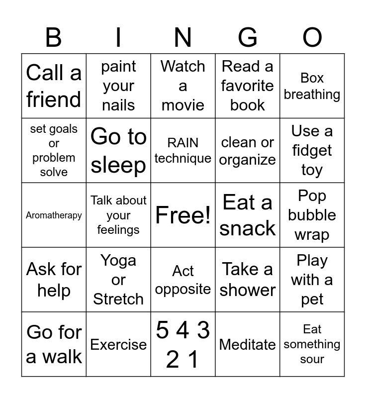 This bingo card has a free space and 29 words: Go for a walk, Listen to music, Talk about your feelings, Journal, Call a friend, Watch a movie, Go to sleep, Yoga or Stretch, Eat a snack, Exercise, Pop bubble wrap, Eat something sour, 5 4 3 2 1, Meditate, Use a fidget toy, Hit a pillow or punching bag, Act opposite, Ask for help, Box breathing, Aromatherapy, Take a shower, Say positive affirmations, clean or organize, set goals or problem solve, Read a favorite book, paint your nails, Play with a pet, RAIN technique and Take a break.
