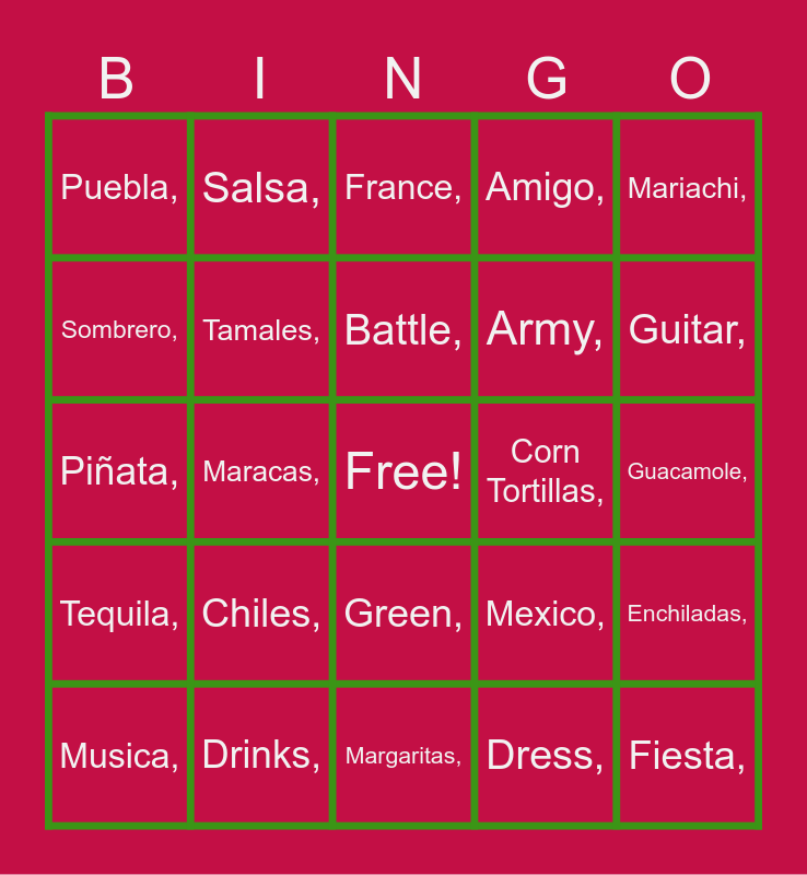 This bingo card has a free space and 42 words: Balloons,, Battle,, Celebration,, Chiles,, Dress,, Enchiladas,, Fiesta,, Flowers,, France,, Green,, Guacamole,, Guitar,, Maracas,, Mariachi,, May Fifth,, Mexico,, Parade,, Piñata,, Red,, Salsa,, Sombrero,, Tacos,, Victory,, Puebla,, 1862,, Batalla,, Army,, Celebration,, Decoration, El soldado,, Nachos,, Tequila,, Tamales,, Margaritas,, Dancing,, Musica,, Drinks,, Corn Tortillas,, Mole,, Queso,, Amigo, and Comida.