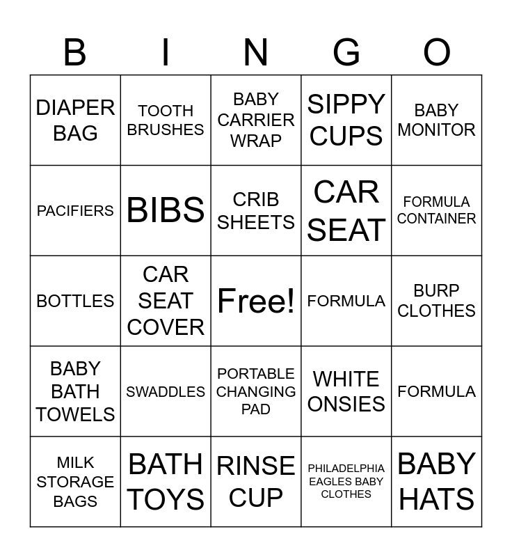 This bingo card has a free space and 29 words: MILK STORAGE BAGS, BABY ACTIVITY CENTER, CAR SEAT COVER, PACIFIER HOLDER, DIAPER BAG, BABY CARRIER WRAP, BIBS, SWADDLES, FORMULA, BATH TOYS, BURP CLOTHES, BABY HATS, RINSE CUP, PHILADELPHIA EAGLES BABY CLOTHES, FORMULA CONTAINER, CRIB MATTRESS, PORTABLE CHANGING PAD, BABY BATH TOWELS, BABY MONITOR, BOTTLES, WHITE ONSIES, BABY FORMULA CONTAINERS, CAR SEAT, PACIFIERS, SIPPY CUPS, TOOTH BRUSHES, FORMULA, CRIB SHEETS and CAR WINDOW SHADE.