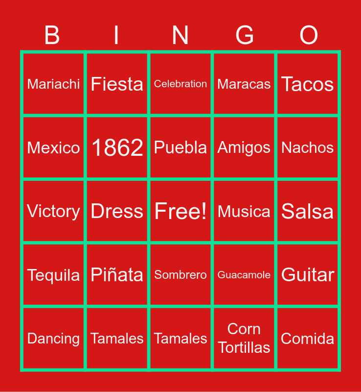 This bingo card has a free space and 81 words: Balloons, Battle, Celebration, Chiles, Dress, Enchiladas, Fiesta, Flowers, France, Green, Guacamole, Guitar, Maracas, Mariachi, May Fifth, Mexico, Parade, Piñata, Red, Salsa, Sombrero, Tacos, Victory, Puebla, 1862, Batalla, Army, Celebration, Decoration, El soldado, Nachos, Tequila, Tamales, Margaritas, Dancing, Musica, Drinks, Corn Tortillas, Queso, Amigos, Comida, Balloons, Battle, Chiles, Dress, Enchiladas, Fiesta, Flowers, France, Green, Guacamole, Guitar, Maracas, Mariachi, May Fifth, Mexico, Parade, Piñata, Red, Salsa, Sombrero, Tacos, Victory, Puebla, 1862, Batalla, Army, Celebration, Decoration, El soldado, Nachos, Tequila, Tamales, Margaritas, Dancing, Musica, Drinks, Corn Tortillas, Queso, Amigos and Comida.