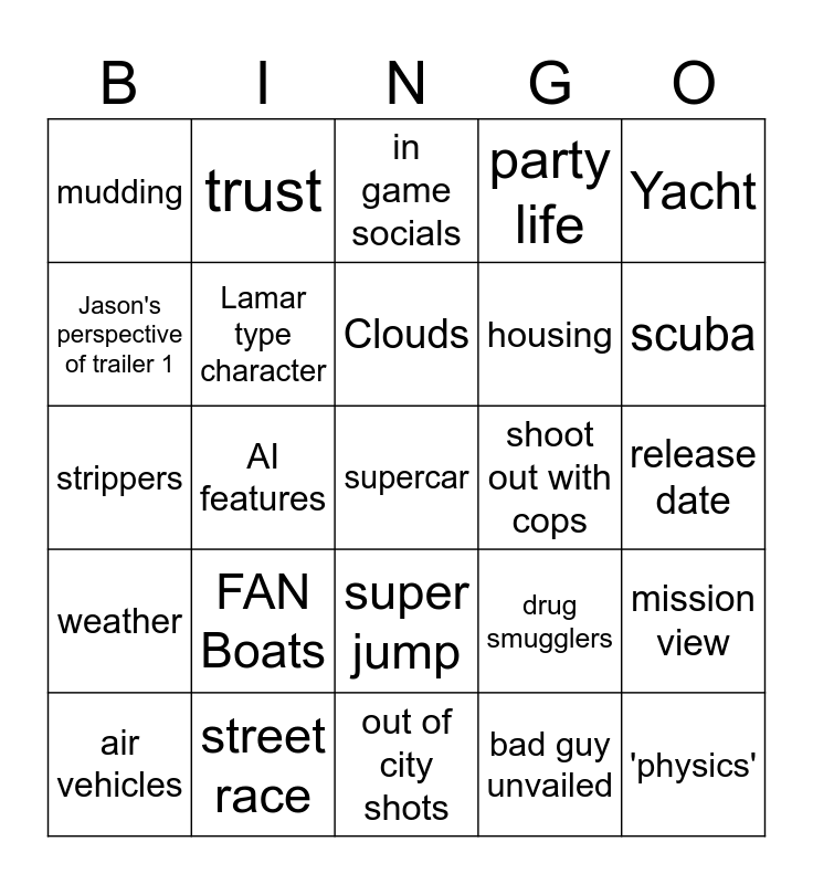 This bingo card has a free space and 24 words: FAN Boats, street race, Clouds, air vehicles, Yacht, mudding, Jason's perspective of trailer 1, trust, shoot out with cops, super jump, housing, strippers, drug smugglers, mission view, Lamar type character, bad guy unvailed, release date, in game socials, scuba, AI features, 'physics', weather, party life and out of city shots.
