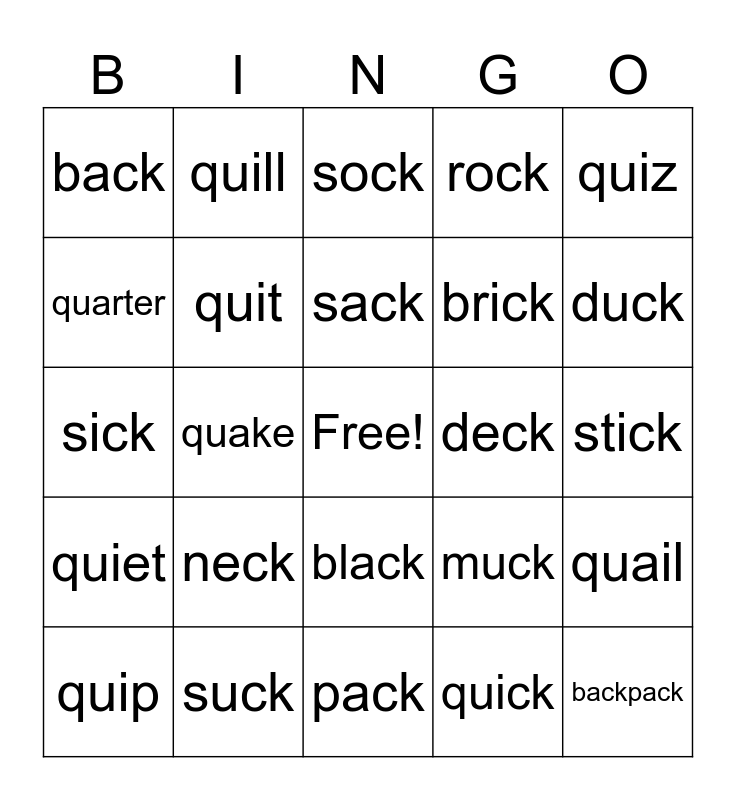 This bingo card has a free space and 34 words: queen, quick, quack, quilt, quiet, quit, quiz, quip, quill, quick, sack, sock, kick, lick, deck, duck, suck, sick, neck, muck, black, stuck, back, stick, pack, backpack, rock, check, brick, quarter, quote, quake, quail and question.