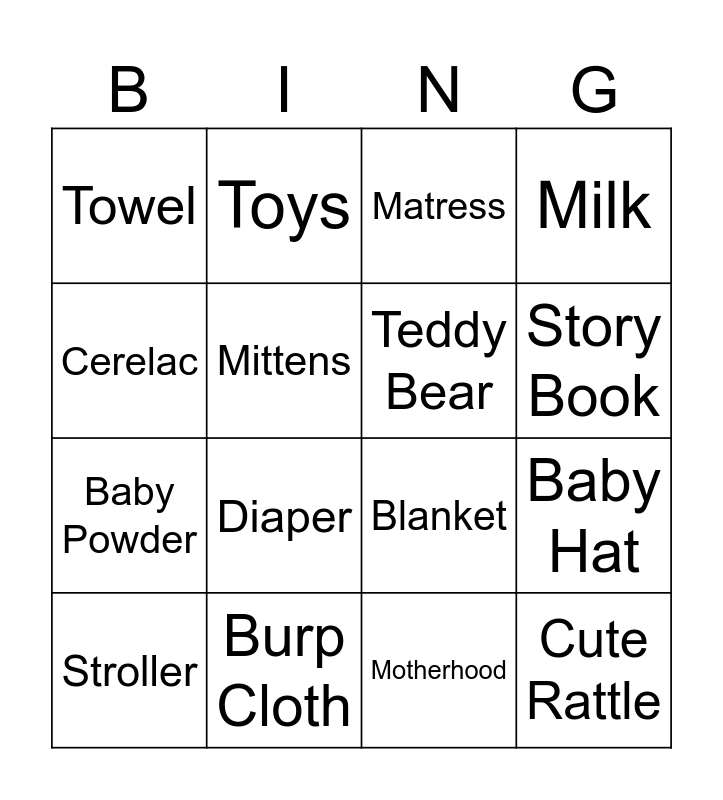 This bingo card has 60 words: Bottle, Bib, Crib, Cute Rattle, Nappy, Baby Wipes, Teddy Bear, Jumpsuit, Baby Powder, Baby Oil, Milk, Socks, Mittens, Baby Lotion, Rubber Duck, Towel, Stroller, Cerelac, Pacifier, Story Book, Burp Cloth, Matress, Bath Tub, Baby Cream, Baby Shampoo, Car, Teether, Baby Monitor, Diaper, Baby Soap, Frock, Sleep, Playtime, Crawling, Toys, Photo Album, Balloons, Baby Hat, Doll, Blanket, Nursery, Nail Clipper, Motherhood, Infant, Toddler, Massage, Cuddles, Swaddle, Tummy time, Fatherhood, Baby Walk, Baby Smile, Baby Arrival, Baby Pillow, Shoes, Sterilizer, Baby Feeding, Walker, Little Prince and Little Princess.