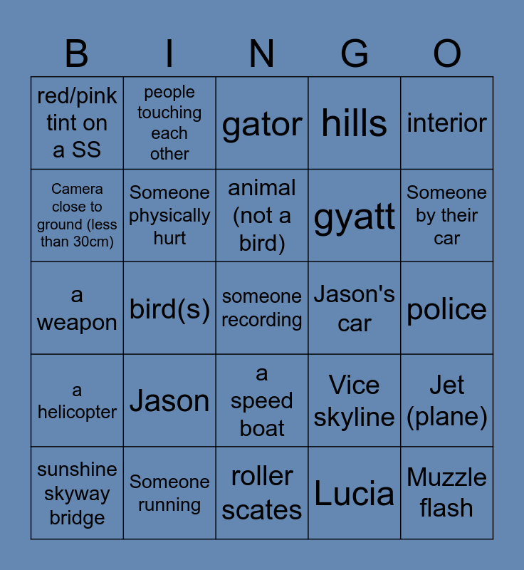 This bingo card has 25 words: Jason, roller scates, animal (not a bird), sunshine skyway bridge, interior, red/pink tint on a SS, Camera close to ground (less than 30cm), people touching each other, Jason's car, a speed boat, gyatt, a weapon, Vice skyline, Jet (plane), Someone physically hurt, Muzzle flash, police, gator, Someone by their car, bird(s), someone recording, Someone running, a helicopter, hills and Lucia.